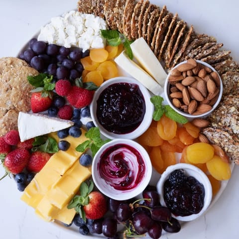 Sweet and savory brunch board with jams, cheeses, fruits, nuts, and artisan breads for flavorful gatherings.
