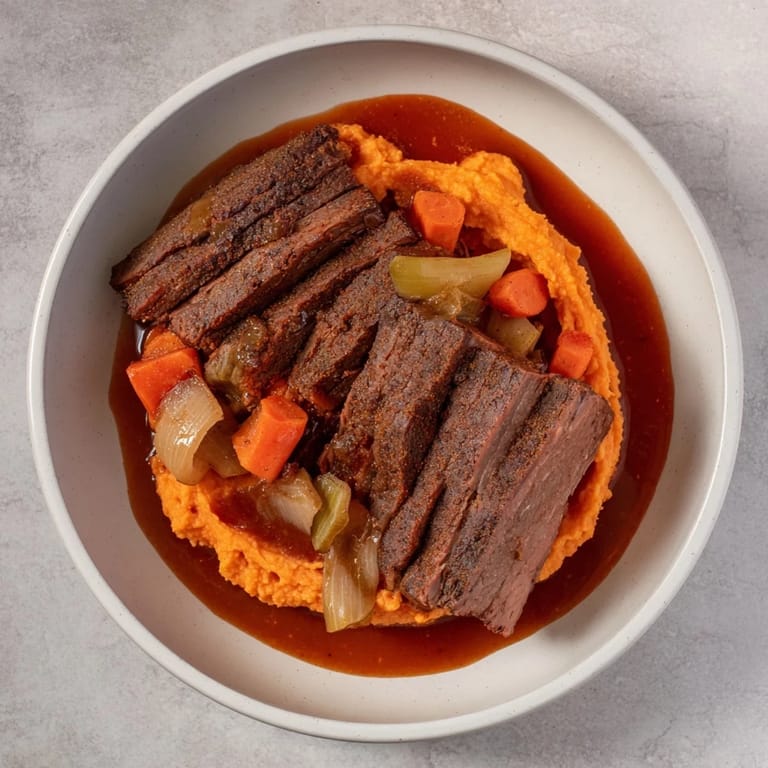 Pin Recipe A comforting, slow-cooked beef brisket served with creamy mashed sweet potatoes&a hearty, flavorful meal perfect for family gatherings or special occasions.
