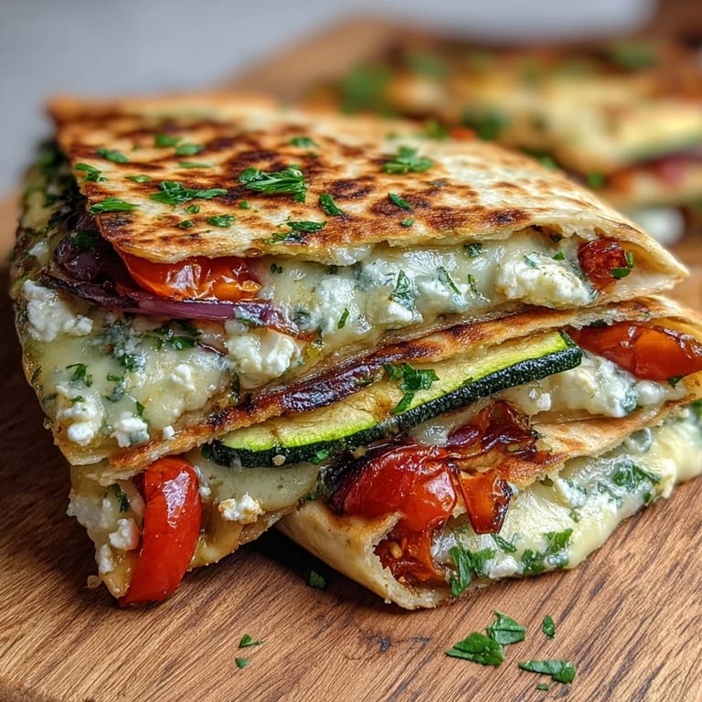 Pin Recipe Golden, crispy whole wheat tortillas filled with a medley of smoky grilled vegetables, fragrant herbs, tangy feta, and gooey mozzarella—these quesadillas deliver all the vibrant flavors of the Mediterranean in every bite. Perfect for a relaxed lunch, dinner, or backyard gathering.