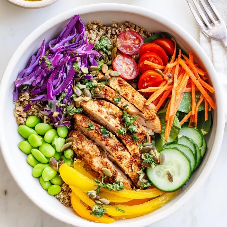 Pin Recipe A vibrant, nutrient-packed meal featuring colorful vegetables, wholesome grains, lean protein, and a zesty dressing, designed for easy meal-prep and beautiful presentation.