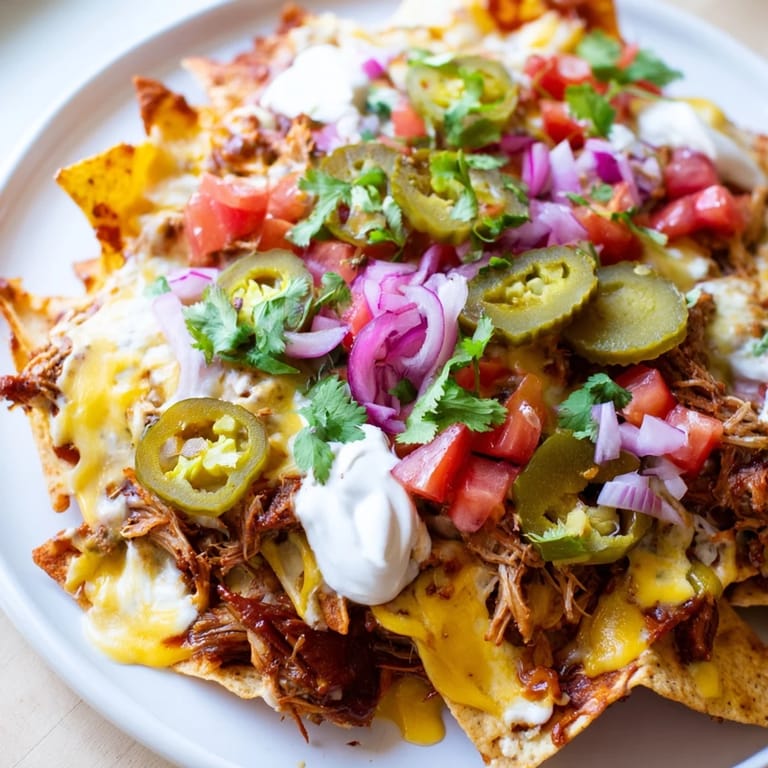 Pin Recipe Nachos showed up in my life during a particularly chaotic dinner party when I realized I'd way overcommitted on the menu. A friend grabbed a bag of chips from my pantry, and I threw together some pulled pork and cheese sauce on the fly—and somehow that became the thing everyone kept coming back to. Now when I make these loaded nachos, I'm always transported back to that kitchen, the smell of melting cheese mixing with smoky pork, people hovering around the baking sheet like it was the main event.