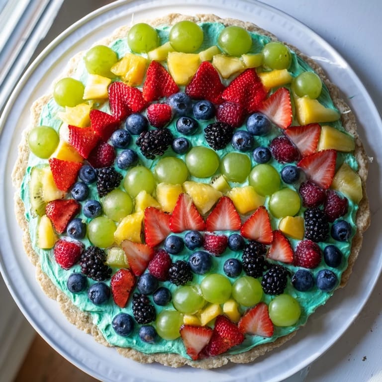 Pin Recipe A whimsical and colorful dessert pizza featuring a sugar cookie crust topped with a creamy frosting and an array of vibrant fresh fruit arranged in a beautiful mermaid tail pattern—perfect for parties or themed celebrations.