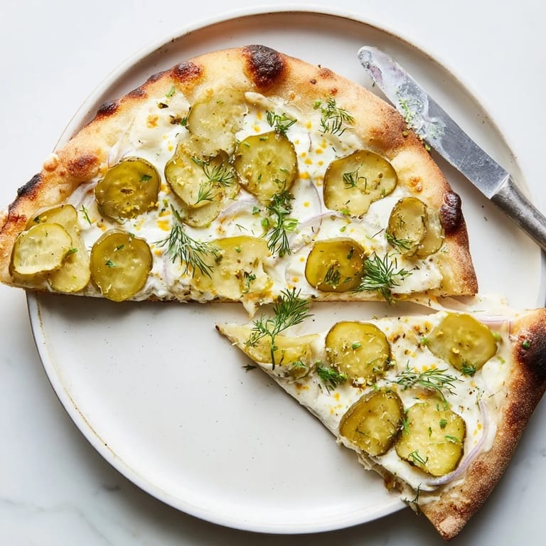 Pin Recipe A tangy, creamy pizza topped with a rich crème fraîche sauce, mozzarella, and crunchy dill pickles. Perfect for adventurous pizza lovers seeking a unique flavor combination.
