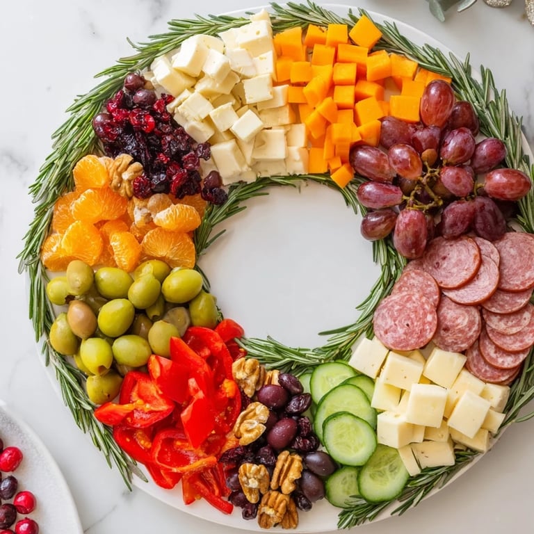 Pin Recipe A festive, easy-to-assemble wreath-shaped grazing board, perfect for holiday entertaining. Features a colorful assortment of cheeses, charcuterie, crackers, and fresh produce, arranged in a beautiful circular display.