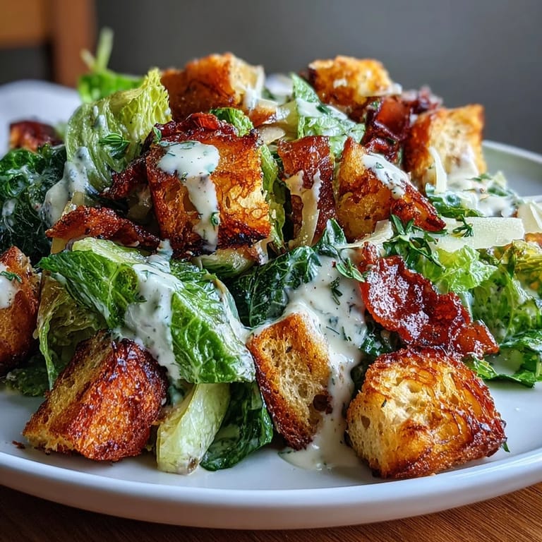 Pin Recipe My neighbor Sarah showed up one afternoon with a container of sourdough starter and a determined look, insisting I learn to bake with it. Weeks later, I had more bread than I knew what to do with, so I started cubing the day-old loaves and tossing them in olive oil. That's when everything clickedβgolden, shattering croutons that actually tasted like something, paired with a Caesar dressing I'd finally learned to emulsify without breaking. This salad became my answer to every potluck, and honestly, it's the croutons that make people ask for the recipe.
