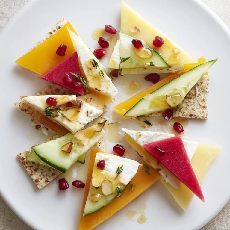 Every triangle you place tells a story—the earthy depth of aged cheddar next to the bright snap of a cucumber slice, the creamy surprise of goat cheese meeting the crunch of almonds. The genius of triangular pieces is that they're not just visually stunning; they force you to think about proportion and balance in every bite. A wedge of pear against a salty cracker against a cool bell pepper creates flavor conversations that rectangular slices never achieve. When you tessellate ingredients this way, you're not just arranging food; you're composing a symphony where every element gets its moment to shine.