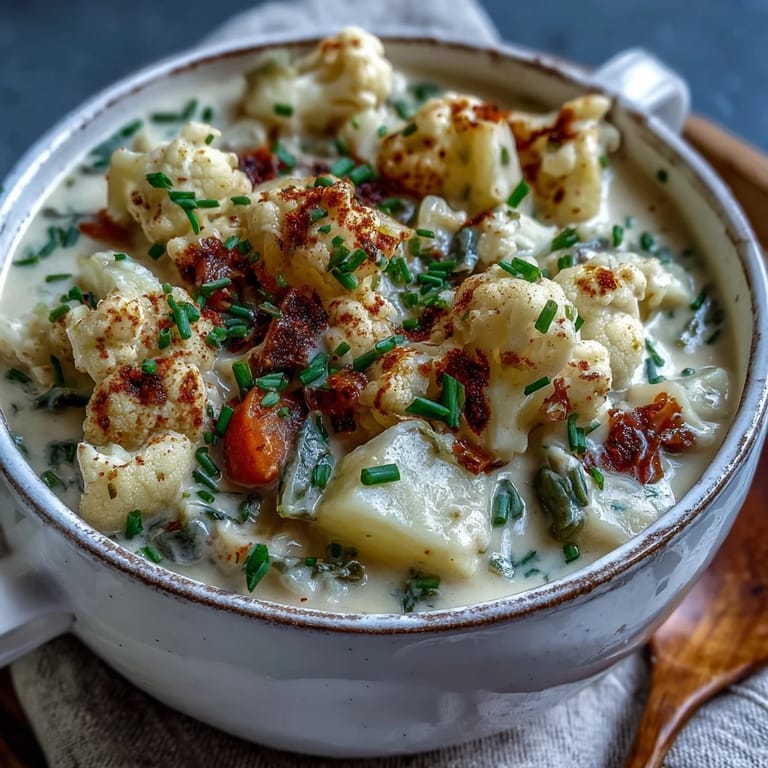Pin Recipe There's something magical about the sound of vegetables hitting hot oil on a quiet weeknight, especially when you're cooking without a plan. I'd opened my fridge to find half a head of cauliflower, a few potatoes, and the sudden desire for something warm and deeply satisfying. What emerged was this vegetarian chowder, creamy and gentle, nothing fancy but somehow better than anything I'd been craving. My roommate walked in halfway through and asked what smelled so good, and honestly, I couldn't quite explain it until we sat down with bowls in our hands.