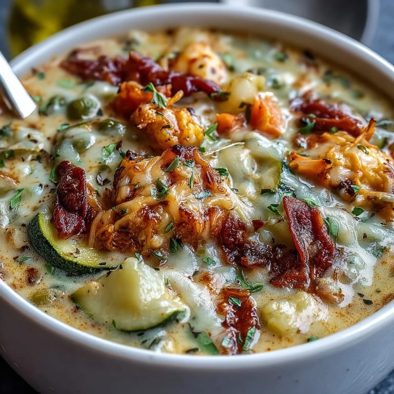 This hearty vegetable soup combines the best of both worlds: the wholesome goodness of fresh vegetables and the irresistible richness of garlic Parmesan cream. The medley of carrots, celery, bell peppers, zucchini, potatoes, corn, and peas creates a satisfying texture, while the blend of Parmesan and mozzarella delivers that perfect cheesy pull. Ready in just 50 minutes, this soup is ideal for meal prep, family dinners, or whenever you need something warm and comforting.