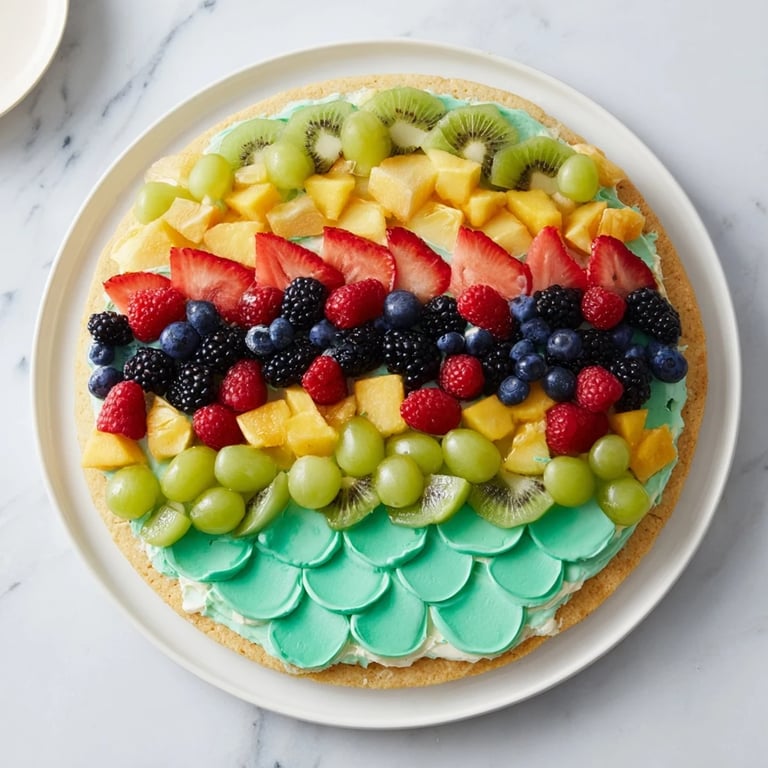 Pin Recipe A whimsical and colorful dessert pizza featuring a sugar cookie crust topped with a creamy frosting and an array of vibrant fresh fruit arranged in a beautiful mermaid tail pattern—perfect for parties or themed celebrations.