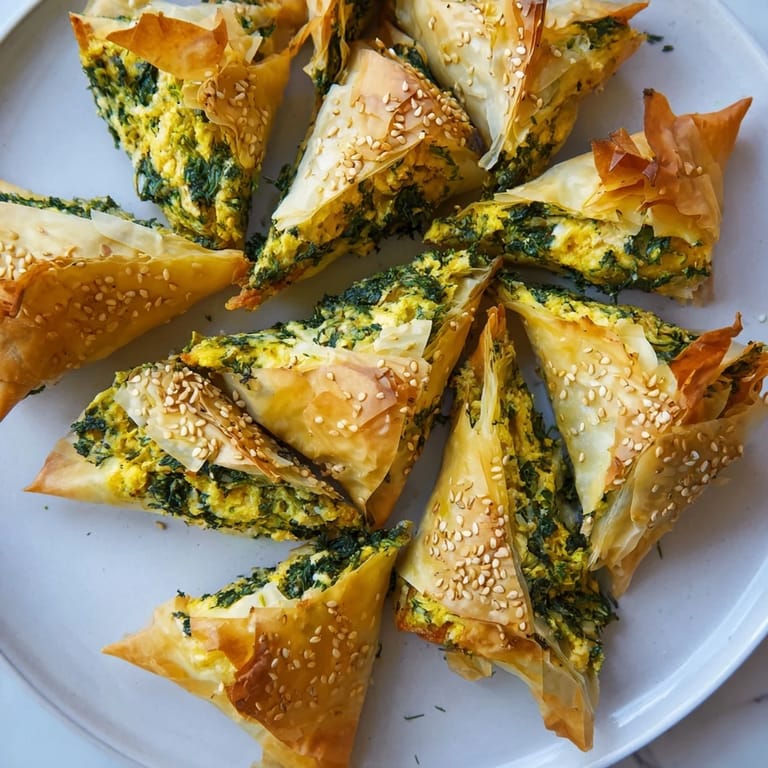 Each mini triangle is carefully crafted by folding generous spoonfuls of a savory filling into delicate phyllo, then baked until golden and irresistible. The blend of feta, ricotta, and fresh herbs brings a bright, creamy texture balanced by the earthiness of spinach and a hint of nutmeg, all wrapped in the lightest, crispest pastry.