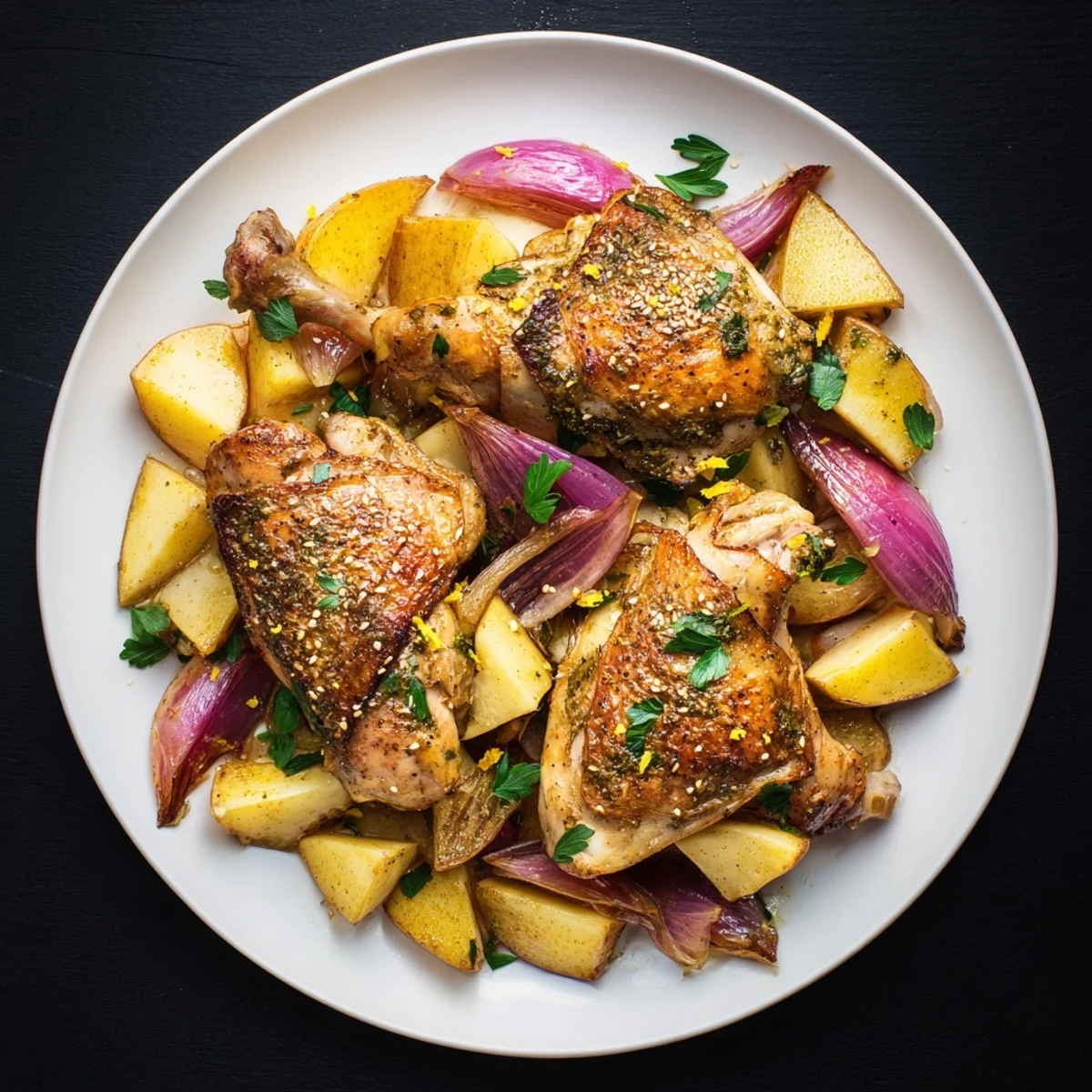 Pin Recipe A vibrant, aromatic dish featuring crispy chicken thighs and golden potatoes, tossed in fragrant zaatar and roasted to perfection a simple weeknight meal bursting with Middle Eastern flavors.